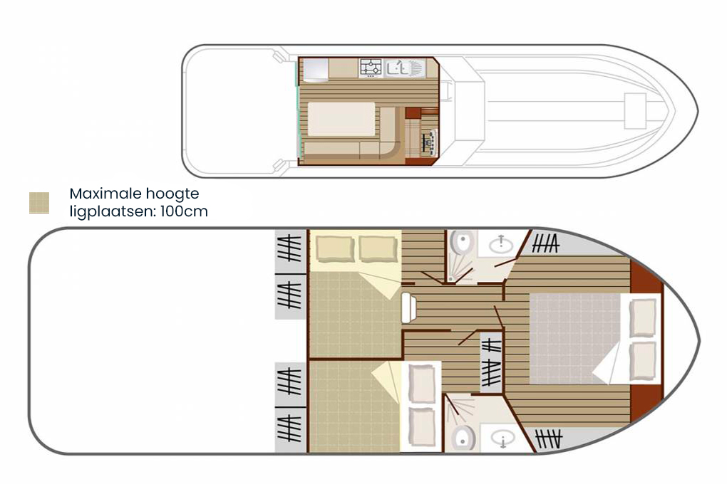 De Nicols 1000 uit de Sedan-serie is een ideale rivierboot voor 1 gezin: hij heeft 3 tweepersoonshutten, waarvan één in de boeg, een enorme slaapkamer die de kapitein waardig is! De andere twee hutten (met een stahoogte van ongeveer 100 cm boven het bed) zijn geschikt voor kinderen of gasten.