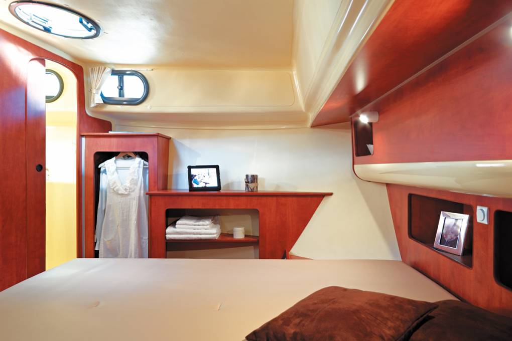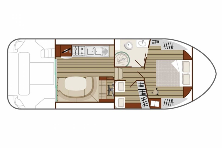 Suggestie: hoewel Nicols boten niet het label 'toegankelijk voor gehandicapten' hebben, zijn sommige van onze modellen meer dan andere geschikt voor mensen met beperkte mobiliteit. De Estivale en Fly serie zijn bijvoorbeeld toegankelijk vanaf de achtersteven, via een brede poort. Door de boot aan de achtersteven af te meren, is het gemakkelijk om met een rolstoel van de ponton naar het achterterras te gaan. Het achterterras ligt op hetzelfde niveau als de woonkamer, die toegankelijk is via een grote erker: ook hier is rolstoelgebruik mogelijk. De woonkamer heeft een keukenhoek, een ontbijthoek en een zitbank die kan worden omgevormd tot een tweepersoonsbed. Om de toiletten, douches en andere nachtcabines te bereiken, moet je door een gang van ongeveer 60 cm breed, die over het algemeen toegankelijk is via 2 of 3 treden. Idealiter moet de persoon met beperkte mobiliteit ten minste in staat zijn om op te staan, alleen of onder begeleiding, om de paar treden te nemen die nodig zijn om de toiletten te bereiken.