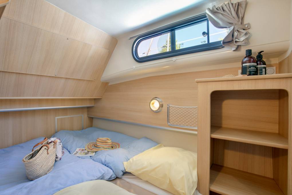 Suggestie: hoewel Nicols boten niet het label 'toegankelijk voor gehandicapten' hebben, zijn sommige van onze modellen meer dan andere geschikt voor mensen met beperkte mobiliteit. De Estivale en Fly serie zijn bijvoorbeeld toegankelijk vanaf de achtersteven, via een brede poort. Door de boot aan de achtersteven af te meren, is het gemakkelijk om met een rolstoel van de ponton naar het achterterras te gaan. Het achterterras ligt op hetzelfde niveau als de woonkamer, die toegankelijk is via een grote erker: ook hier is rolstoelgebruik mogelijk. De woonkamer heeft een keukenhoek, een ontbijthoek en een zitbank die kan worden omgevormd tot een tweepersoonsbed. Om de toiletten, douches en andere nachtcabines te bereiken, moet je door een gang van ongeveer 60 cm breed, die over het algemeen toegankelijk is via 2 of 3 treden. Idealiter moet de persoon met beperkte mobiliteit ten minste in staat zijn om op te staan, alleen of onder begeleiding, om de paar treden te nemen die nodig zijn om de toiletten te bereiken.