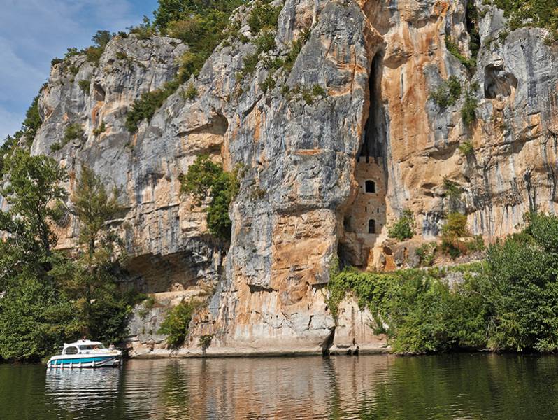 8. Bouziès: klifpad langs de rivier de Bouziès is het startpunt van het jaagpad naar Saint-Cirq-Lapopie (10 km heen en terug). Het pad, dat rechtstreeks in de kalksteenrots is uitgehouwen, is indrukwekkend. Ontdek het te voet of volg de route op het water aan boord van je boot. Het hoogtepunt is het fresco dat in de rots is uitgehouwen. Als je langs de Lot vaart, kijk dan zeker omhoog om het Château des Anglais te zien, een verbazingwekkende verdedigingspost genesteld in de spleten van de klif.